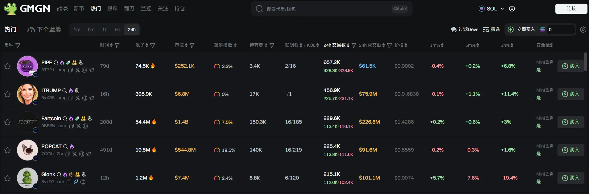 过去 24h Solana 热门代币前五依次为:PIPE、ITRUMP、Fartcoin、POPCAT、Glonk