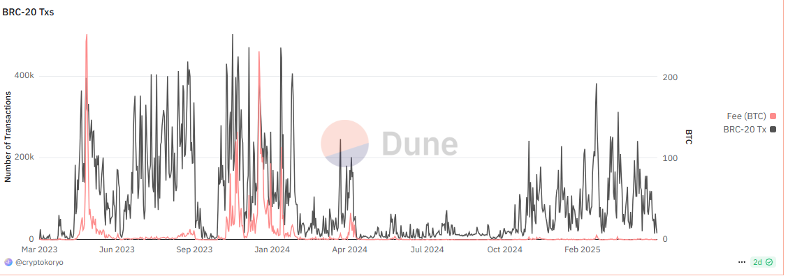 回想 2024 年春,比特币生态宛如一颗耀眼的超新星。BRC-20 代币标准的兴起,依托 Ordinals 协议的铭文热潮,点燃了市场的狂热。铭文——将独特数据直接嵌入比特币最小单位「聪」(satoshi)的创新——让链上活动如火箭般起飞。ORDI 等代币价格一飞冲天,部分资产在短短数周内市值翻倍甚至数倍。SATS、RATS 等项目也加入狂欢,带来令人瞠目的回报。比特币链上交易量激增,Gas 费用飙升,矿工收入水涨船高。这是一个黄金时刻,创新、投机与热情交织,仿若预示着比特币的新纪元——不仅作为数字黄金,更作为一个充满活力的去中心化金融(DeFi)平台。