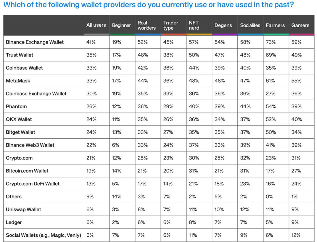同时钱包也存在顶部集合状态,资深用户(拥有 2 年以上经验)集中于币安、Coinbase、MetaMask 或 Trust(占比超 54%),而新手群体中任何单一钱包的份额均不足 20%