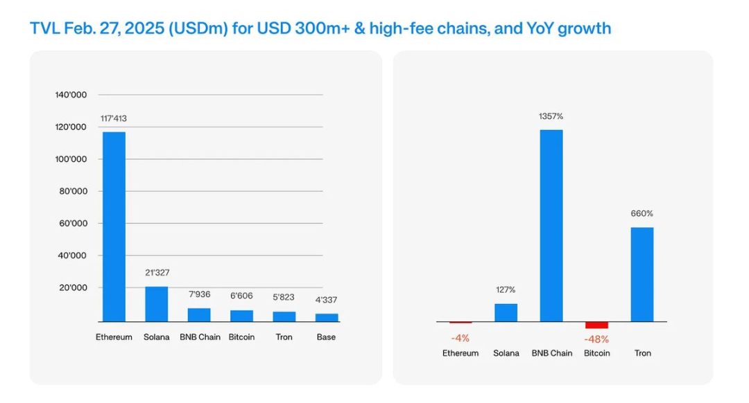 - Solana 的费用同比增长 3000%,TVL 同比增长 127%,领跑所有 L1;
