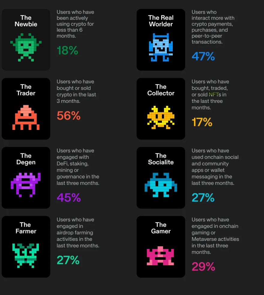 投机仍是核心驱动力。尽管在过去一个季度中,54% 的用户实际使用加密货币进行支付或点对点转账,但当被问及他们最喜欢的活动是什么时,只有 12% 的受访者选择了支付。炒币(现货、MeMe 币、DeFi 活动)依旧是每周最频繁的行为,几乎覆盖了所有用户类型。因而投机行为将会持续掠夺加密货币支付这一公用事业未来的关注份额。