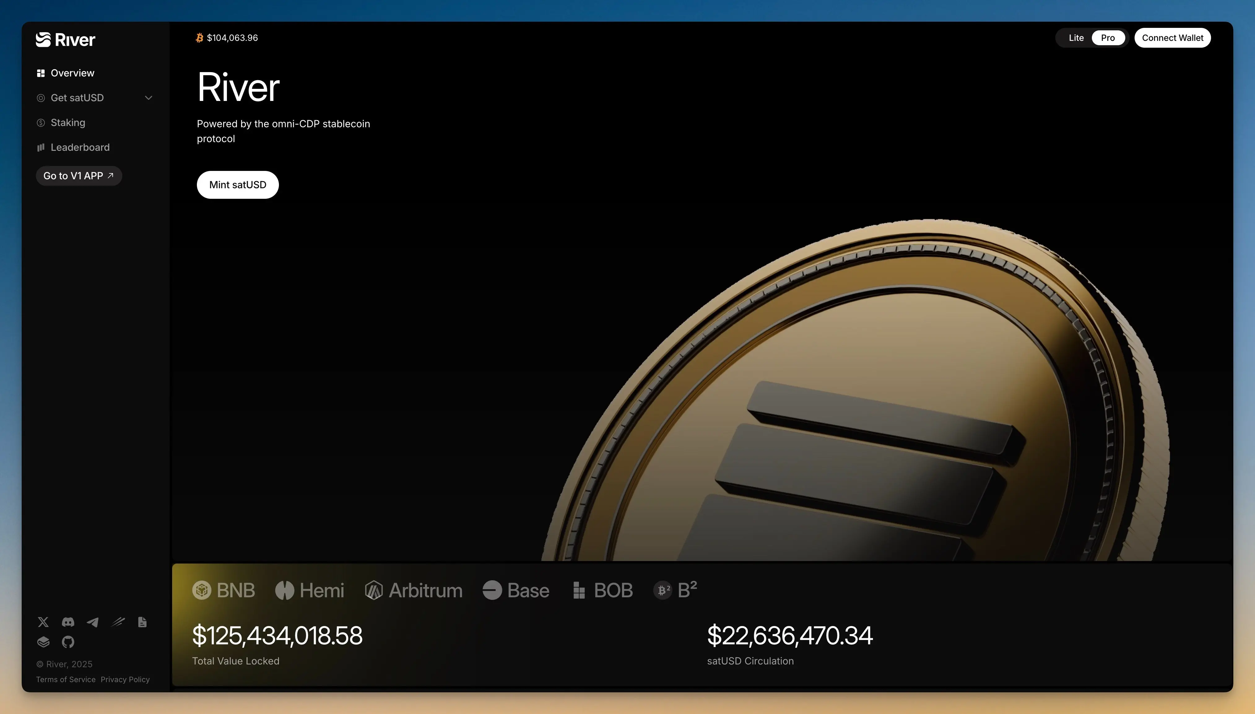 River 是建立于 Omni-CDP 架构上的链上资本循环系统,支持跨链抵押、稳定币铸造、收益分配与社群贡献治理。稳定币 satUSD 整合 LayerZero 技术并以 OFT 标准发行,实现全链流动性的流通,结合 satUSD+ 与 4FUN 完成从资产、收益到影响力贡献的完整死循环。