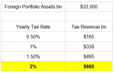 目前,外国投资组合资产的总价值约为33万亿美元。假设价格恒定且没有资本因税收而外流,我们来看看每年的税收收益情况。