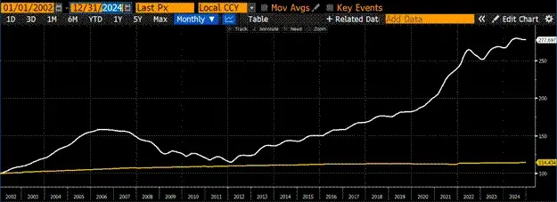 美国15-64岁工作年龄人口(金色)仅增长了14%,但Cash Shiller全国房价指数(白色)增长了177%:美国房地产市场的特殊表现。这相当惊人,因为2008年全球金融危机的数据也包含在内。