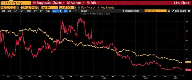 这个图表展示了美国长期国债ETF(TLT)以黄金计价(金色)和比特币计价(红色)的表现,自2009年起以100为基准。从2021年至今,国债相较黄金和比特币分别贬值了64%和84%。