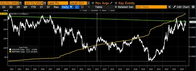 接下来的三个图表,我使用的是2002年至2025年初的数据,因为中国在2002年加入了世界贸易组织,而2025年1月初是美国市场上“特朗普要修复世界”的乐观情绪高涨的时期。