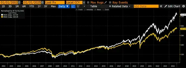 自2022年以来,MSCI美国指数(白色)表现优于MSCI世界指数(金色)148%:美国股市的特殊表现。