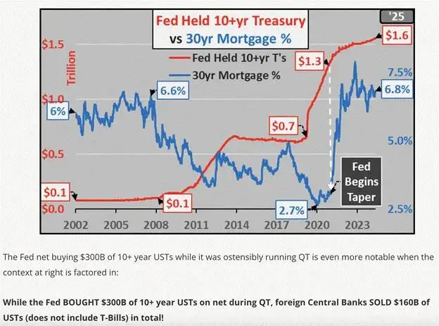 美联储正在缩减其资产负债表。然而,它在如何实现这一目标上拥有一定的自由裁量权,尤其是因为政策的任务是净减少,而不是在所有期限类别中均匀减少。耶伦(Yellen)和现在的贝森特(Bessent)需要为政府庞大的债务提供资金。外国投资者和美国私营部门喜欢购买国库券,因为它们是短期债券并支付利息,意味着它们是高收益的现金替代品,比低收益的银行存款更受欢迎。但没有人愿意购买长期的,即10年及以上的国债。为了帮助耶伦和现在的贝森特筹集资金,美联储通过进行10年期国债的量化宽松(QE)给予了很大的支持。鲍威尔(Powell)引用政府赤字作为问题,但继续通过印钞机压低10年期收益率以保持政治上可接受的低水平,这种行为非常不诚实。