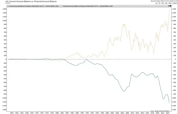 下方的图表是我所有分析的基石。如果你是储备货币发行国并且必须开放资本账户,那么贸易赤字会导致资本账户盈余。