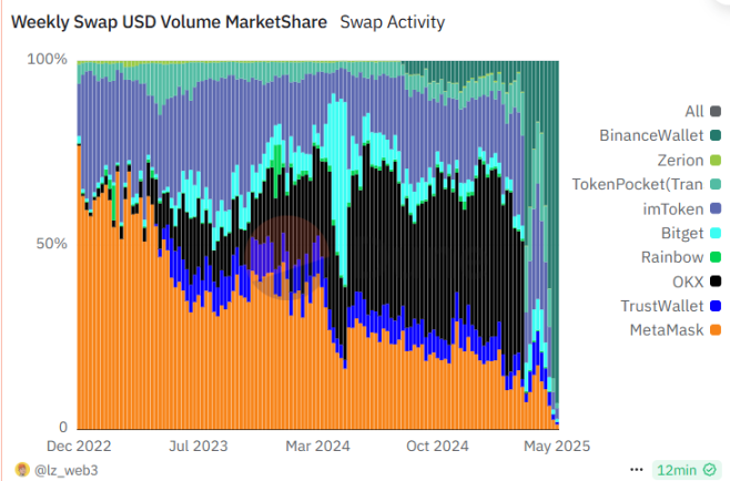 在现今的市场环境下。MetaMask 可能通过 DAO 治理代币实现去中心化运营,并将代币功能与跨链交互深度绑定乃至手续费返现等,强化其作为多链枢纽的定位。这种「延迟满足」式策略虽略显 PUA,却也让社区持续使用 Swap 功能、参与跨链交易,以期提高空投权重。而随着各大交易所积极扩展钱包产品线和链上流动性的集聚,发币也不失为一次差异化竞争的机遇,以期回收流动性的同时提升用户活跃度。