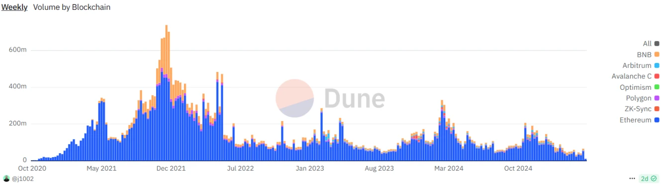 作为以太坊生态的头部钱包,尽管发币一再推迟,但 MetaMask 以其 300 万月活用户的庞大规模,使得代币空投预期始终是社区关注的焦点。而从交易数据上看,现今 Metamask Swap 的交易流量相对较小,长时间内单日交易额不足 1 亿美元,且远低于 Solana 链上平台交易量。而在市场流动性趋势大幅偏向 Solana 链的当下,Metamask 正在逐渐在交易市场中失去占比,从 2022 年底的 77% 到现今的不足 3 %。尽管 Metamask 通过 Snap 等工具积极对接开发者进行 Solana 等外链钱包的引入,但仍不敌各交易所钱包在交易产品上的迅猛增长。