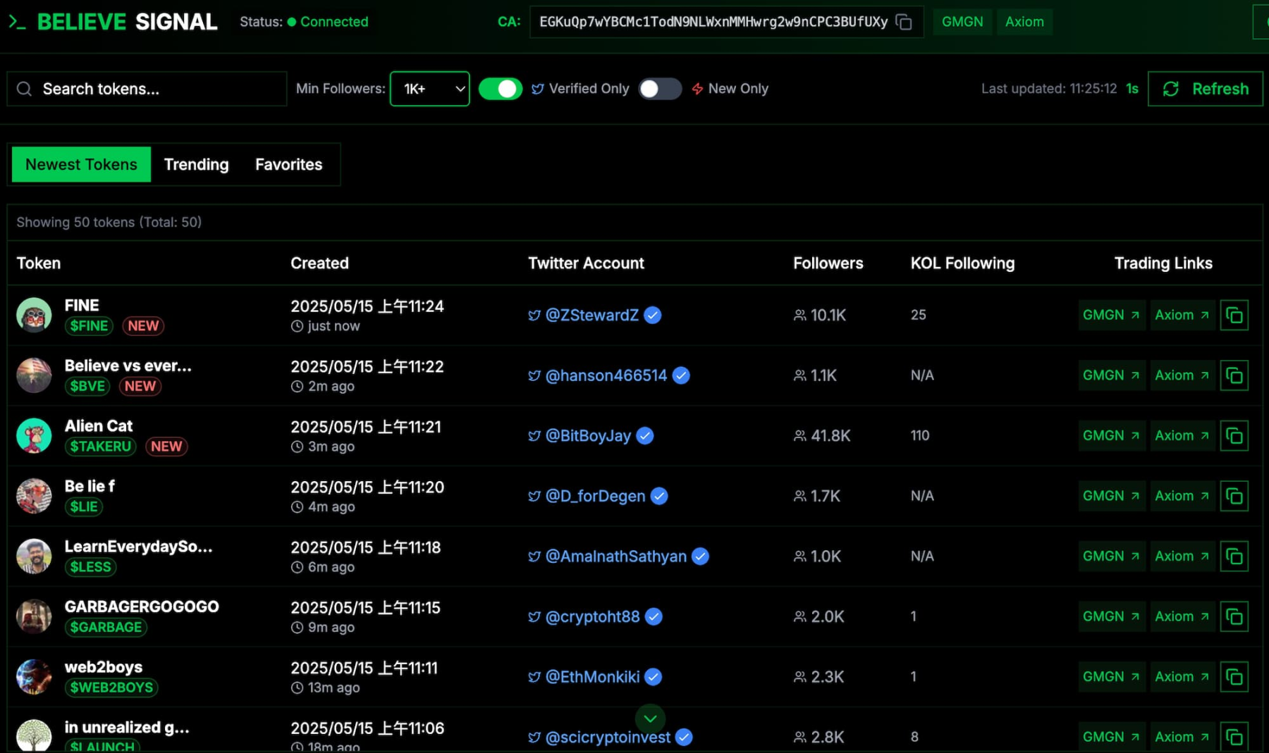Believe Signal 支持按最低粉丝数量、推特账号是否经过验证过滤代币,并且显示推特粉丝数量,以及直接指向 GMGN 的行情数据。