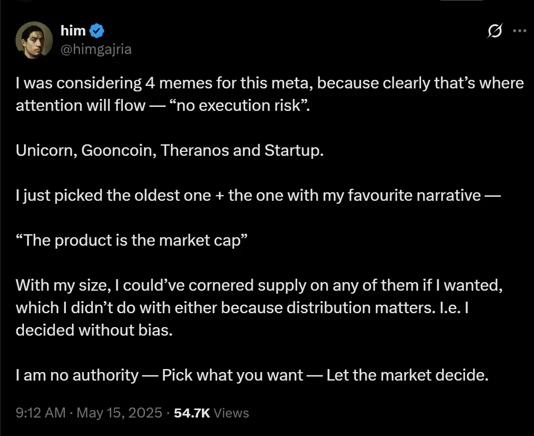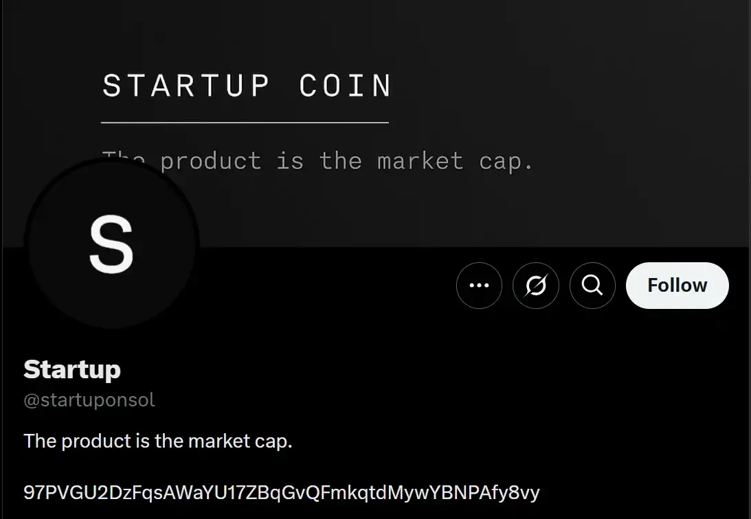 Unicorn、Gooncoin、Theranos 和 Startup,我只是选了最古老的一个+我最喜欢的一个故事——「产品就是市值」(这句话是 meme 币 Startup 官方 X 账号 bio)。