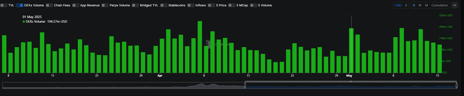 不过,在Binance Alpha宣布上线Sonic生态的两个项目的5月1日,Sonic生态的DEX交易量确实迎来了明显的涨幅。从前一日的7340多万美元飙升至1.94亿美元。