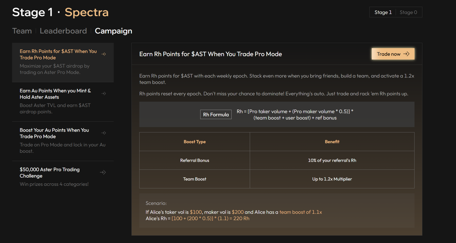 Rh 积分:通过在专业模式下交易永续合约获得,交易量超 30 万美元可获得 3 倍 Au 积分加成,适合高频交易者。(https://www.asterdex.com/en/stage1/campaign)