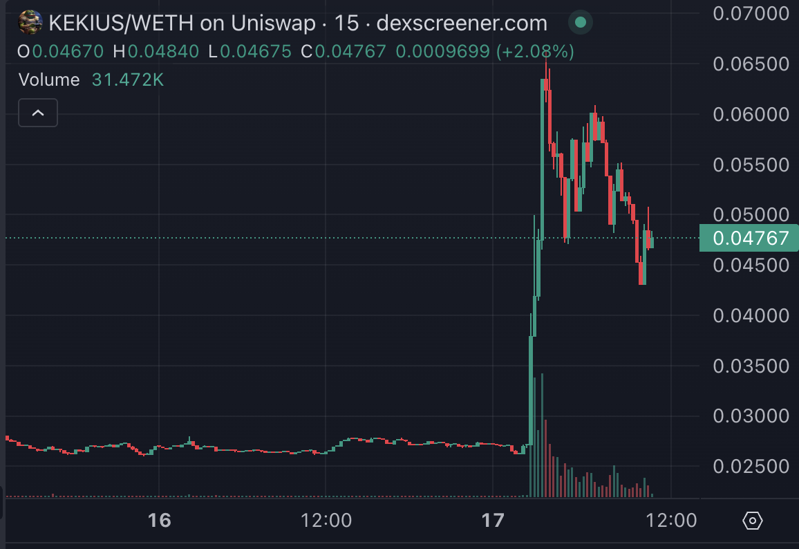 据 Dexscreener 数据显示,部署于以太坊的同名迷因币 $KEKIUS(地址:0x26e550ac11b26f78a04489d5f20f24e3559f7dd9)不足 2 小时便从 0.0027 美元飙升至 0.06638 美元,涨幅达 146 %,市值突破 6,638 万镁。