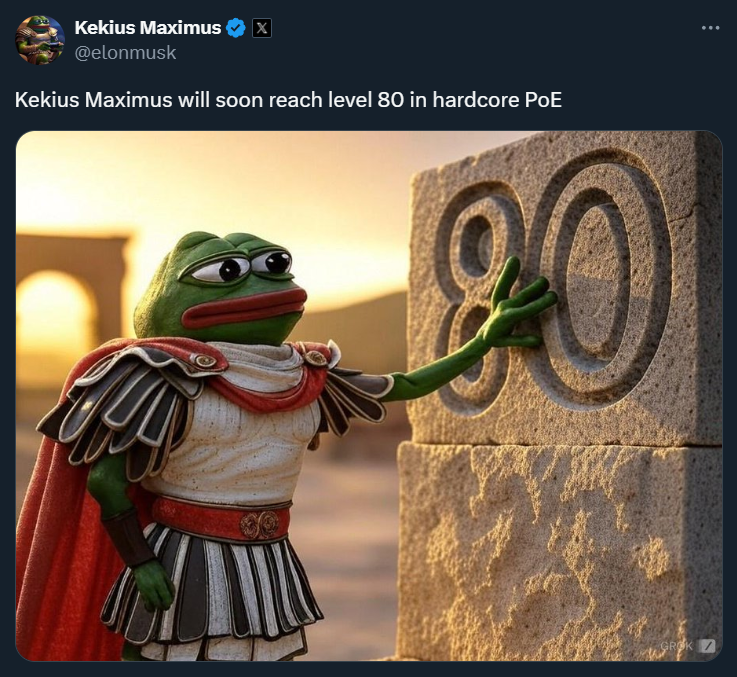 「Kekius Maximus」并非首次登场——去年底 Musk 就曾用此昵称转发 X 用户 Gamer 创作的一张带有 PEPE 形象的 图片 ,且同时将自己的社交头像也修改为一个佩佩蛙,并发文表示:「Kekius Maximus 即将在 Path of Exile 高难度模式中达到 80 级。」