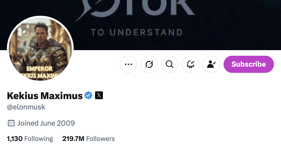 今日凌晨, Musk 先将昵称恢复为「Elon Musk」,随后又改成「Kekius Maximus」,头像同步换成相关 MEME 图。这激励 Kekius Maximus 同名迷因币飙涨。