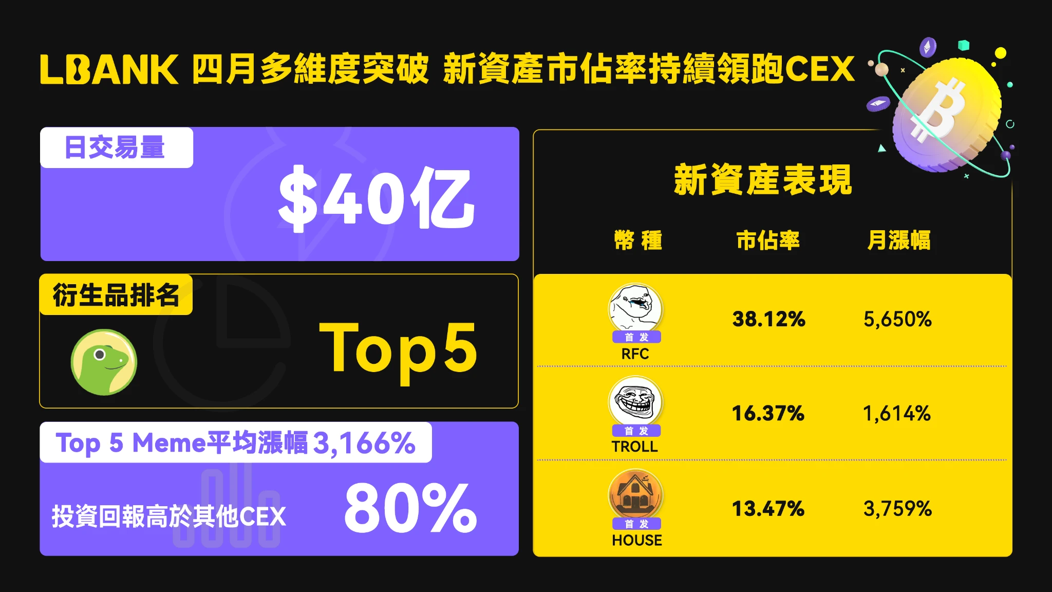 其中,RFC、TROLL、HOUSE 等项目在尚未走红前,便被 LBank 率先捕捉并上线。随着市场热度攀升,这些项目单月涨幅分别达到 5, 650% 、 1, 614% 、 3, 759% ,也再次验证了平台在潜力资产识别与投放节奏上的前瞻性与精准度。从投资回报角度来看,LBank 新上线资产的平均收益率相比其他主流 CEX 高出 80% 以上,进一步巩固其在投资者心中的首发平台形象。