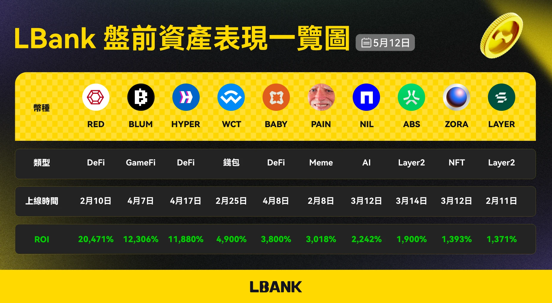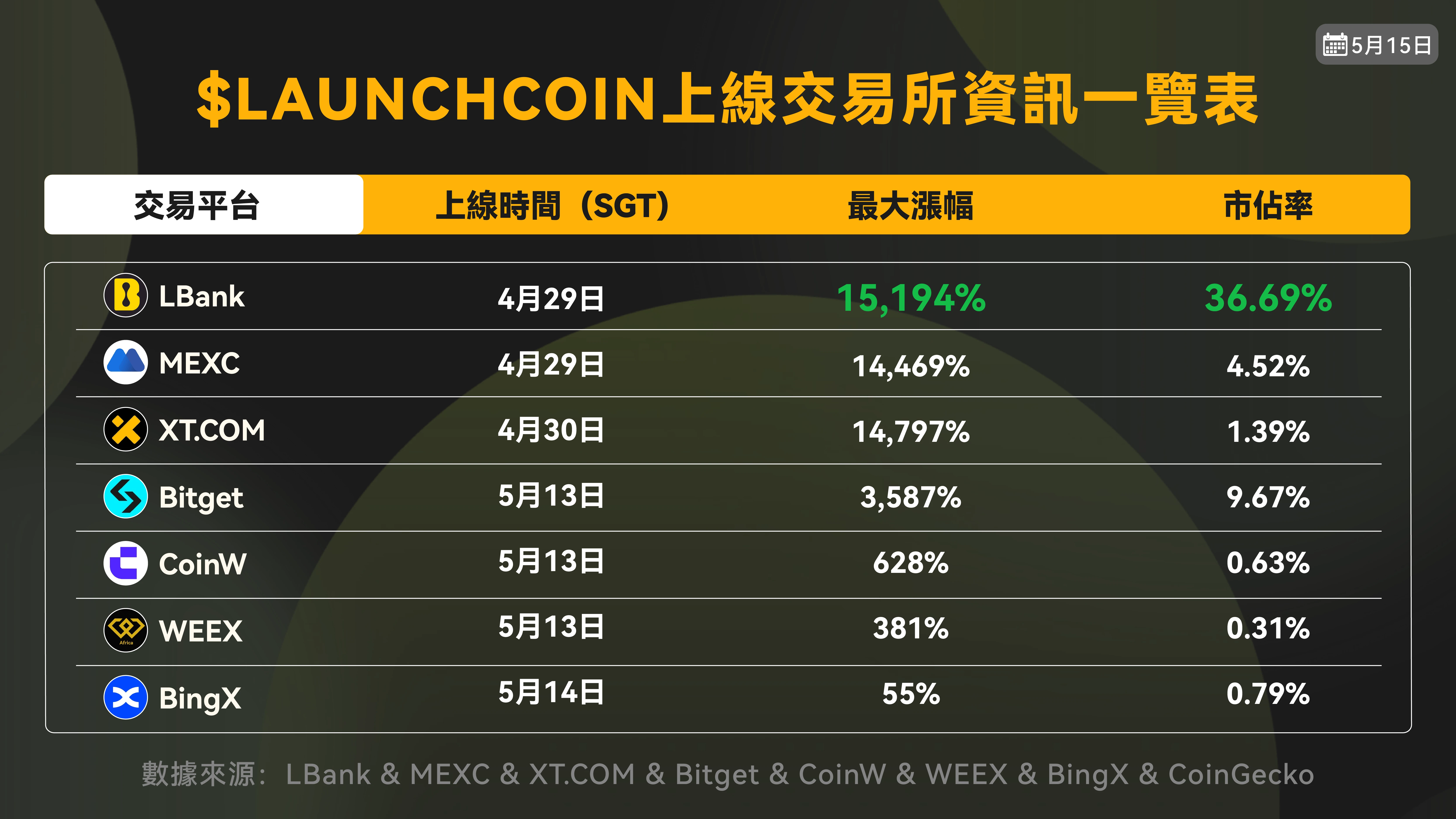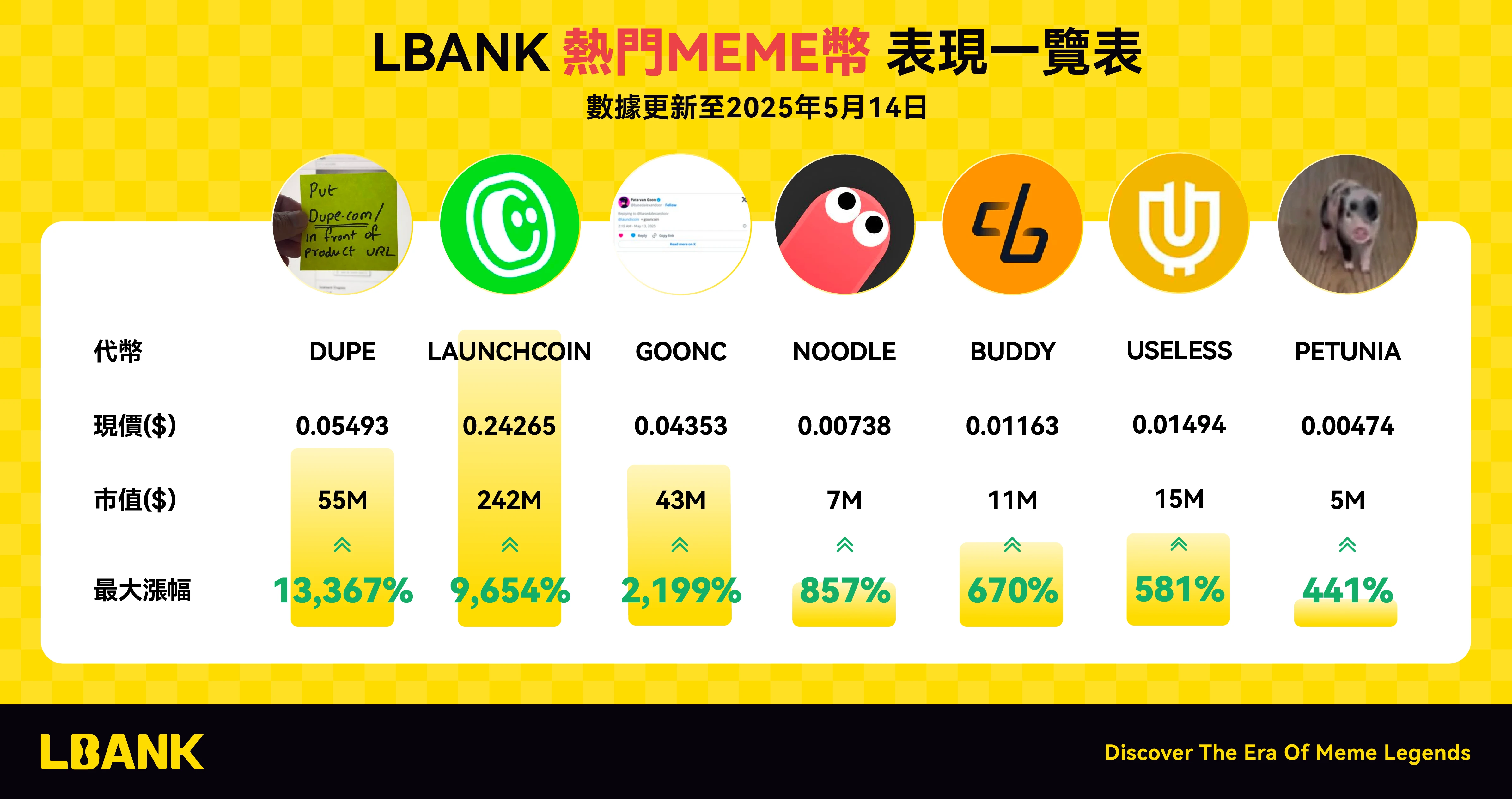 进入 5 月,LBank 在 Meme 资产领域持续领跑,特别是在新势力 PK 加剧的阶段,平台在 LetsBook 与 Believe 系项目上的快速响应,明显快于其他主流平台。在布局节奏与投放窗口的精准把控下,DUPE 与 LAUNCHCOIN 两大项目借助极致的社区传播力与平台级联动支持,分别实现了 13, 367% 与 15, 194% 的最大涨幅(数据截至 5 月 15 日),不仅成为本轮行情中的明星资产,也再次印证了 LBank 在爆款识别与兑现效率上的行业领先地位,其“爆款孵化器”形象进一步巩固。