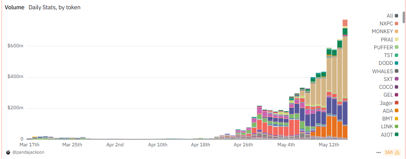 根据 Dune 用户 @pandajackson 制作的数据面板 显示,自推出积分制后,Binance Alpha2.0 的交易量指数级上涨,截止 5 月 15 日,Binance Alpha 的日交易量已达 7.71 亿美元。