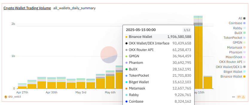 根据 Dune 用户 @lz_web3 制作的 数据面板 ,Binance Wallet 的短期交易量也霸榜整个钱包赛道。