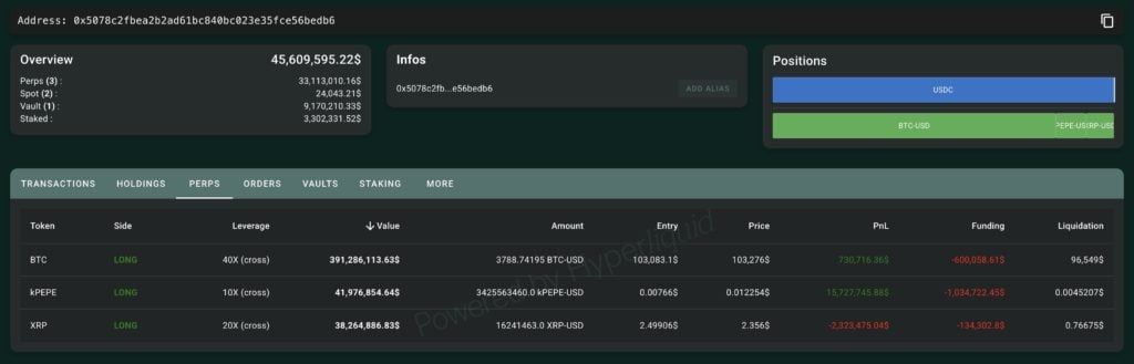 目前以 40x 杠桿𫔭多 3,788.7 枚 BTC,部位价值 3.91 亿美元。𫔭仓价格 $103,083,爆仓价 $96,474。