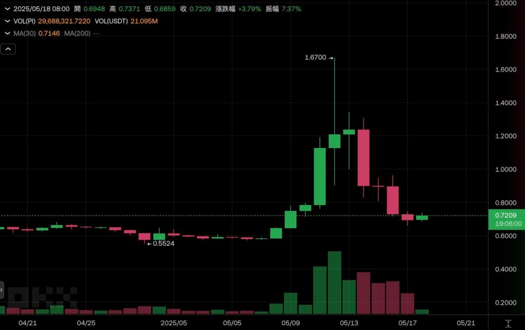Pi 币价格在上缐后一周,最高曾一度逼近 3 美元,但随后就一路下跌。进入四月后有超一个月的时间都在 0.6 美元区间震盪,直到五月中社群传出 Pi Network 官方将在本周刚结束的 Consensus 2025 大会上有重大宣布,币价才重啟涨势,一度触及 1.67 美元。