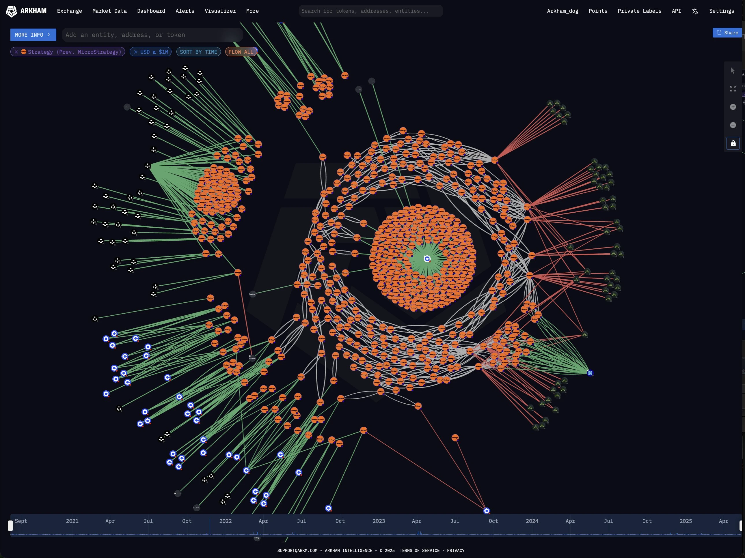 Arkham 对于微策略比特币持仓的地址追踪。来源:Arkham