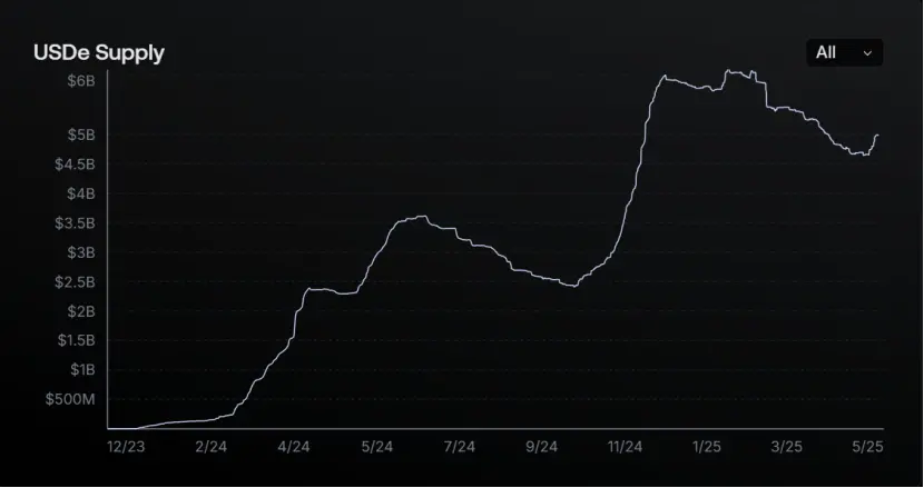 以 Ethena 为例,当前其生态内最活跃的稳定币是 USDe,与 Aave 深度集成,并支持最高90%的借贷抵押率(LTV)。然而,5月以来,USDe 的 TVL 从 57.25 亿美元下滑至 49.93 亿美元,下降幅度近13%。在这背后,Ethena 正在推出另一款更加保守的新型产品 USDtb。