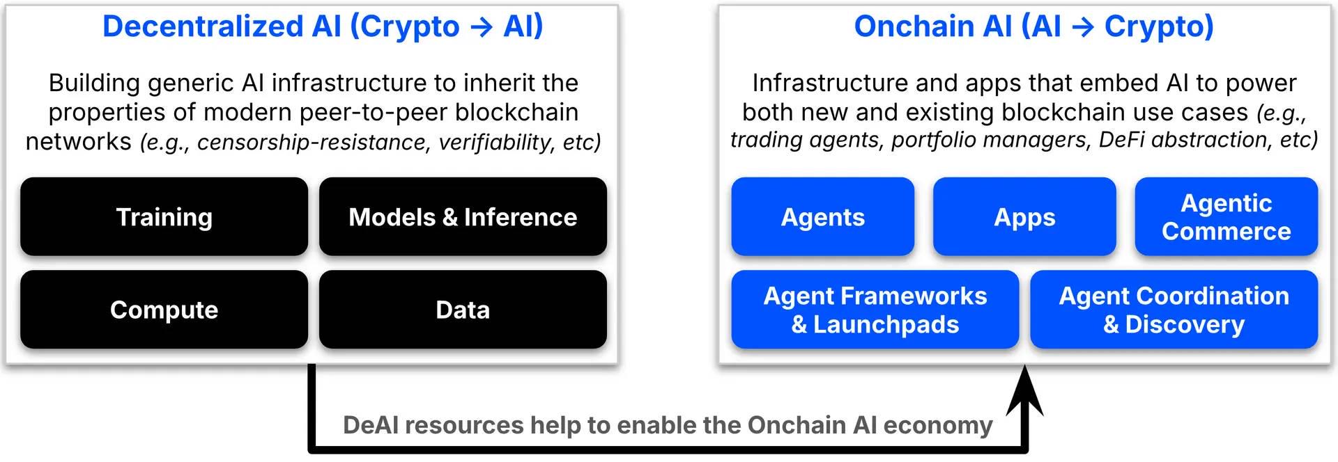 一个关键的区分是去中心化 AI 与链上AI。 去中心化 AI(“Crypto → AI”)指的是构建通用AI基础设施,这些基础设施继承了区块链网络的开放性和点对点特性。这包括努力让计算资源、数据、模型和训练的使用更加民主化,避免AI开发被少数大型公司垄断。这些去中心化AI资源也为链上AI(“AI → Crypto”)提供了支持——链上AI是一个将AI嵌入到新旧区块链用例中的应用与服务生态系统(例如交易代理、链上投资组合管理器、DeFi抽象化等)。尽管去中心化AI项目在过去18个月中获得了大量资金和增长,但我们相信链上AI正在迅速崛起,标志着这一交叉领域的下一阶段创新浪潮。