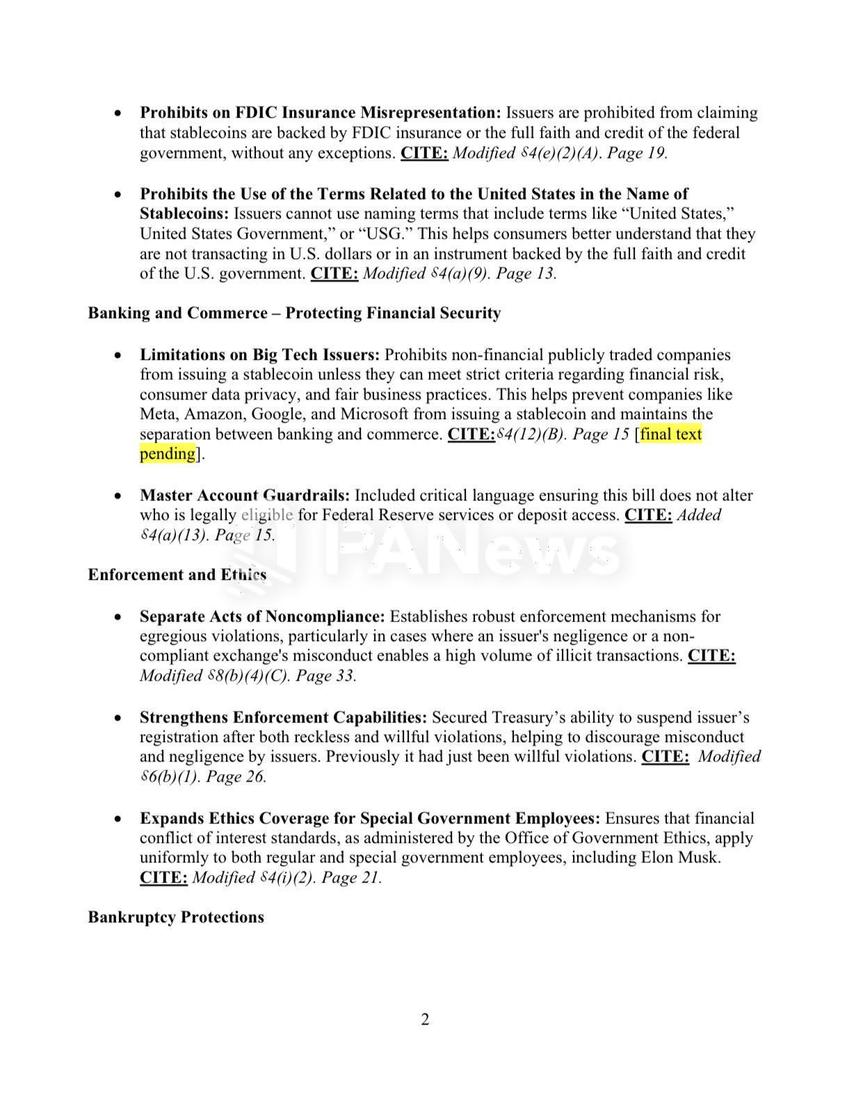 5月15日,据加密记者Eleanor Terrett披露的GENIUS法案草案第2页内容,拟禁止稳定币发行方误导性声称获FDIC保险或使用与美国政府相关术语命名;禁止如Meta、Google等非金融类科技公司发行稳定币,除非符合监管规定,从而强化银行与商业隔离;草案还加强对违规行为的执法能力,拓展政府特别雇员(含Elon Musk)伦理监管范围。