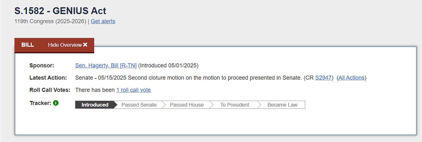 现在,GENIUS Act在参议院终止辩论动议表决通过之后,将进入参议院全面辩论和修改阶段,之后将进入众议院。