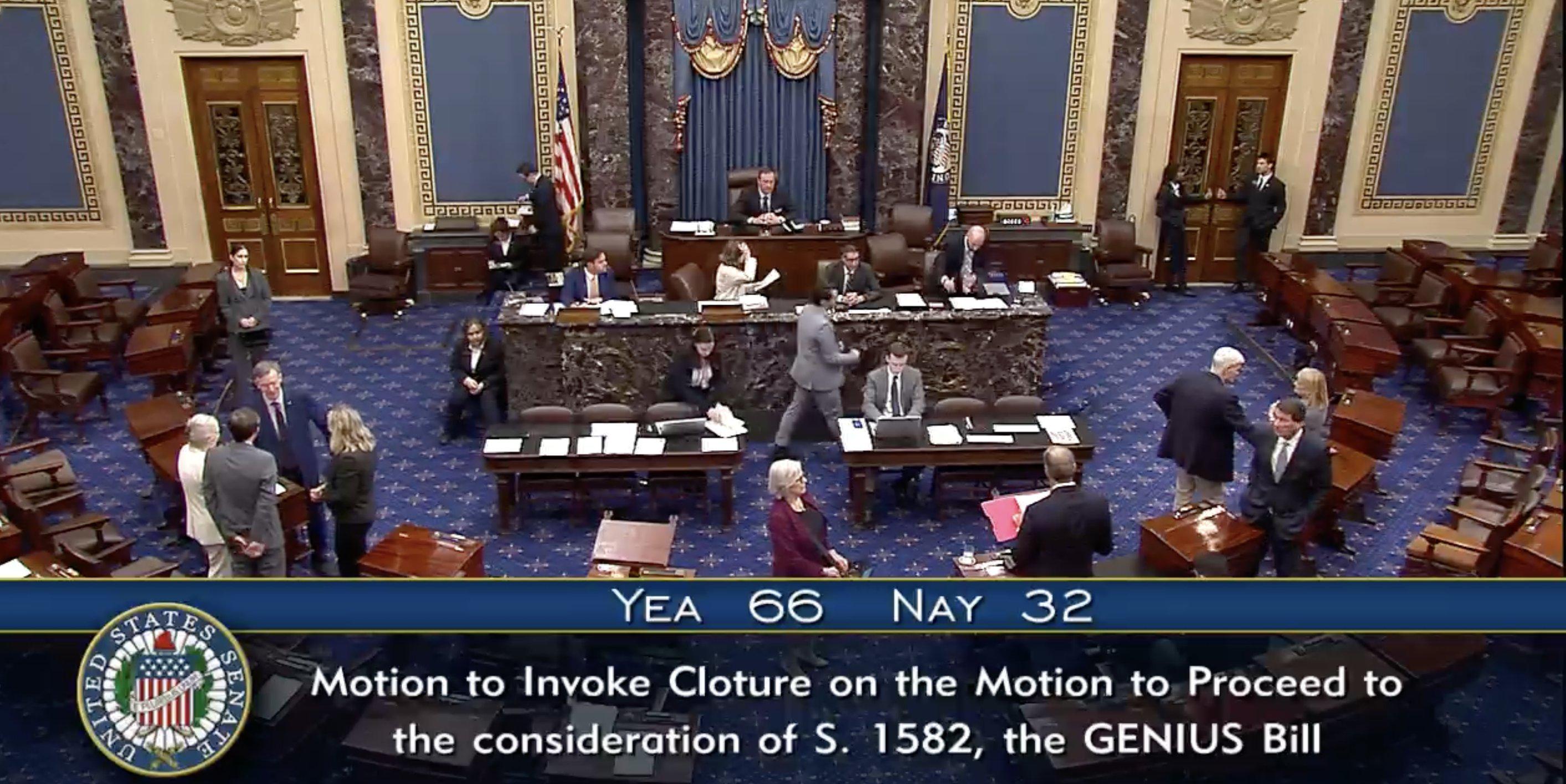5月8日,GENIUS Act在参议院的终止辩论投票(cloture vote)中以48:49票意外失败,未能获得60票。但在5月20日上午,美国参议院再次投票,以66票支持、32票反对的表决结果,通过GENIUS Act稳定币法案的终止辩论动议(cloture)。