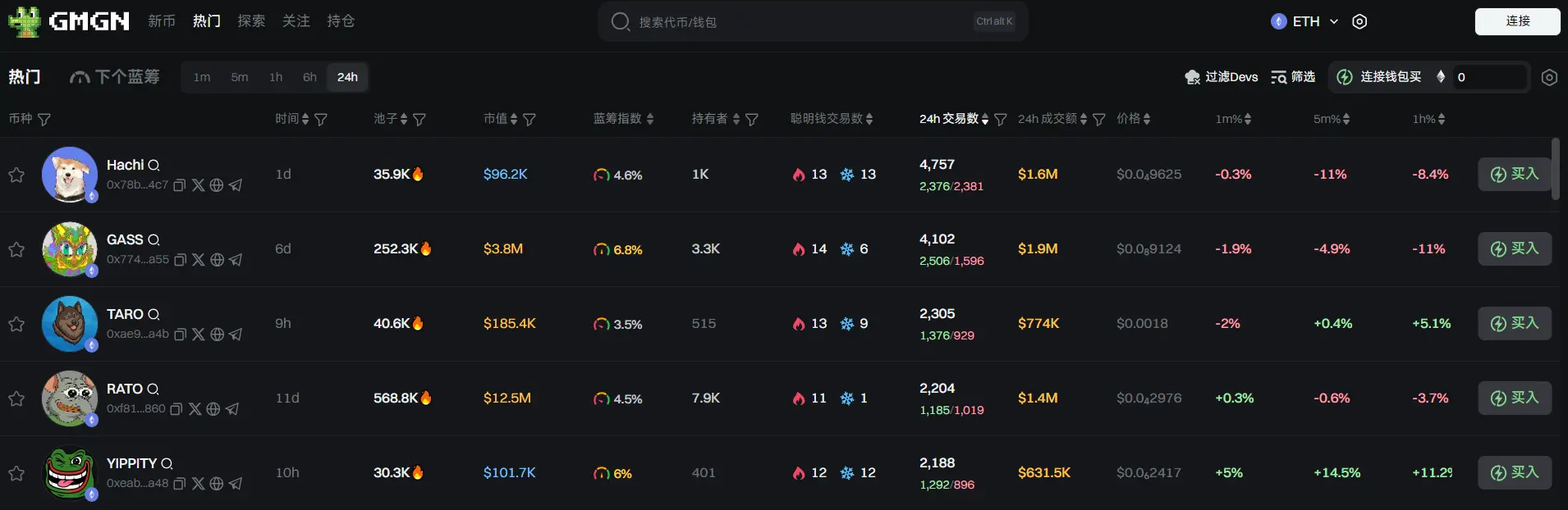 过去 24h 以太坊热门代币前五依次为:Hachi、GASS、TARO、RATO 、YIPPITY