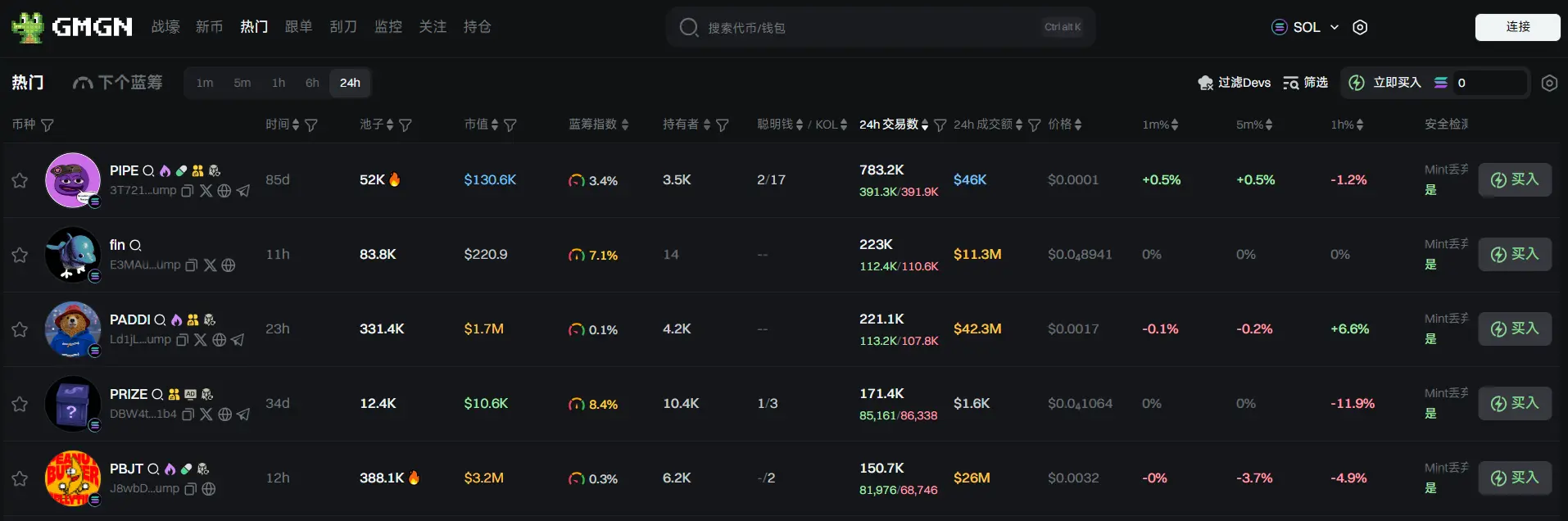 过去 24h Solana 热门代币前五依次为:PIPE、fln、PADDI、PRIZE、PBJT