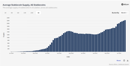 稳定币,顾名思义,是一种通过与法定货币、贵金属、大宗商品或资产组合等基础资产挂钩来提供价值稳定性的加密资产,主要目标是消除许多加密货币所特有的波动性,为用户提供可靠的结算、价值存储和投资工具。作为加密市场中的价值尺度,稳定币的每一次扩张,都反映出行业规模的增长。2017年,全球稳定币的总流通量仅仅不到10亿美元,但来到如今,已然接近2500亿美元,而全球加密市场也从不足万亿,来到了3万亿的规模,从狭小的边缘市场走到了主流的视野中。