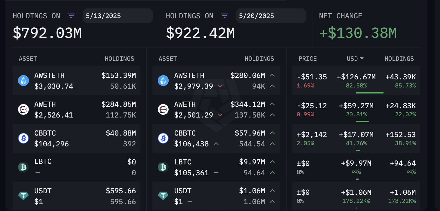 从资金增长节奏来看,自2025年2月中旬以来,该机构的资产规模显著提速,并在近期一度突破10亿美元大关。仅在过去一周(5月13日至20日),其净资产增长便超过1.3亿美元,增幅主要来自AwSTETH(Aave v3 wstETH)仓位的大幅加码,增持金额超过1.2亿美元。