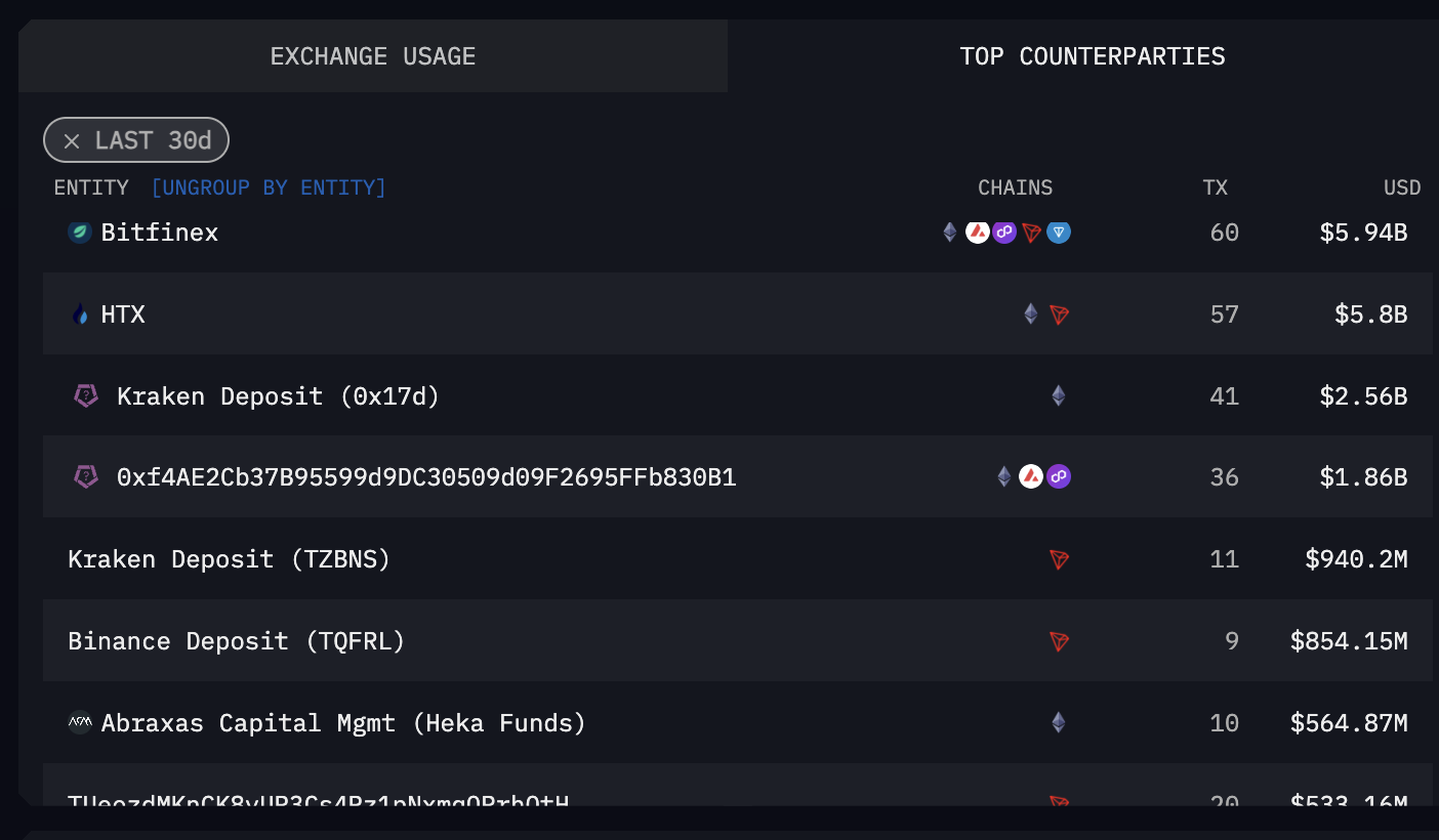 凭借持续的交易与合作,Heka Funds逐渐成长为Tether最大的机构客户之一,可以说Heka Funds也是Tether的快速发展的推手。根据Protos于2021年发布的研究报告,Heka Funds彼时获得了超过15亿美元的USDT,占Tether总发行量的约1.5%。这一年,Heka Funds累计获得约5200万美元利润,远超母公司Abraxas所取得的580万美元利润,成为集团内部最成功的基金之一。而在过去30天,Arkham数据显示,过去30天,Tether主要交易对手中,Heka Funds的交易金额达5.64亿美元,排名第八。
