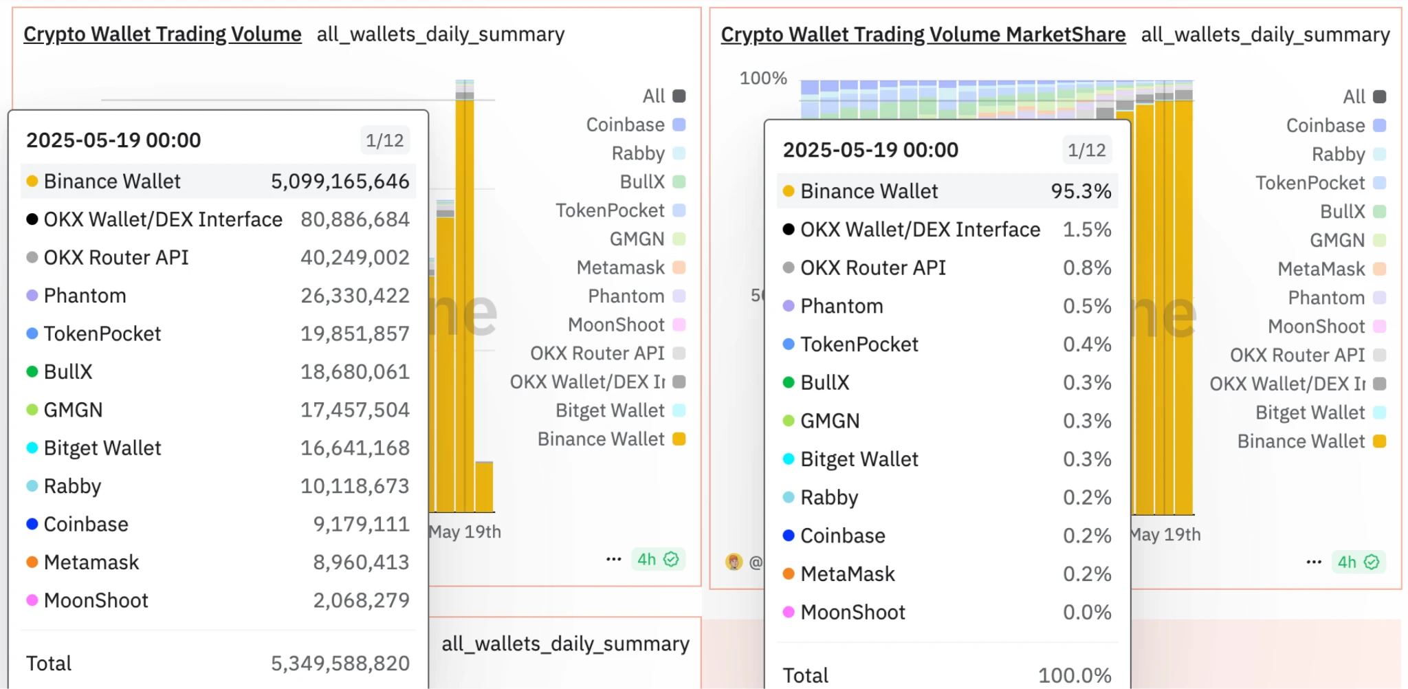 2025 年 5 月 20 日,全球领先区块链生态系统及加密货币交易平台 币安 宣布,其一站式Web3钱包——币安钱包单日交易量突破 50 亿美元,在 Dune Analytics 追踪的 12 个主流钱包中,占据 95.3% 的市场份额,创下全新里程碑。