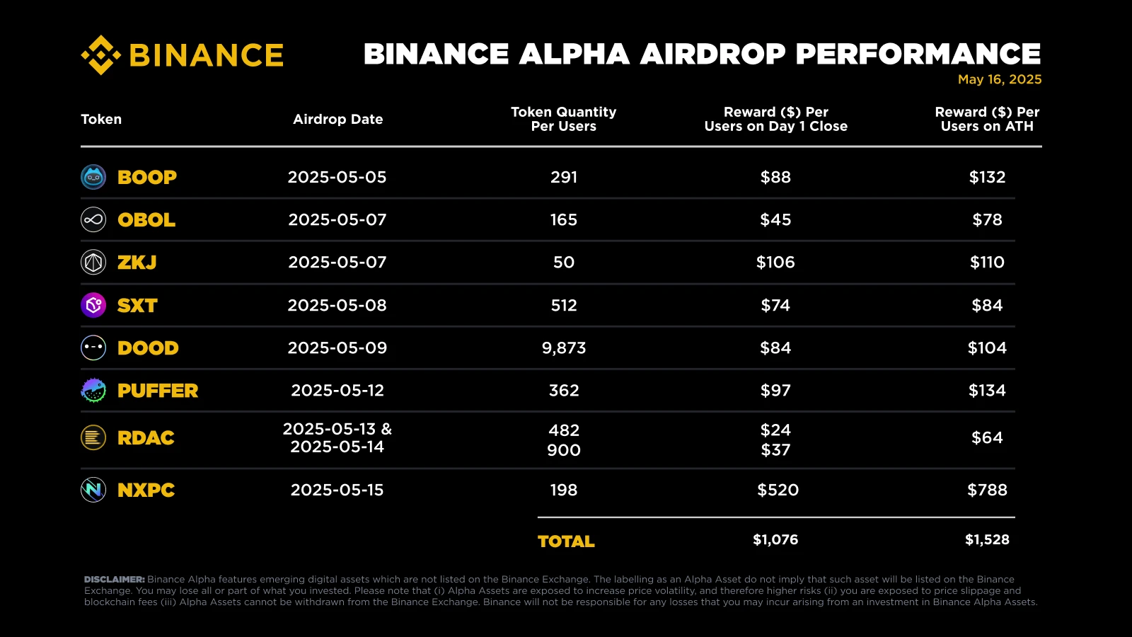Alpha 平台空投奖励: 币安 Alpha 也通过持续空投激励活跃用户。自 2025 年 5 月起,Alpha 已向用户分发 8 轮代币空投,以上线首日收盘价计算,人均获得价值约 1, 076 美元的奖励。