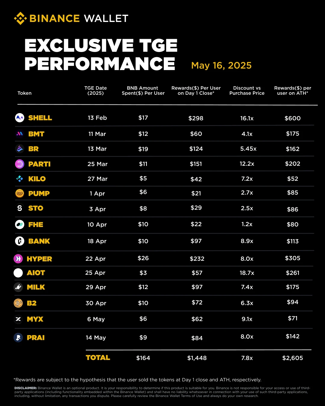 币安钱包专属 TGE: 众多项目选择在币安 Alpha 上独家举办 TGE,原因在于该平台提供的强大流动性与用户参与度。2025 年以来,Alpha 平台共推出 15 场 TGE,参与用户以远低于市场价的折扣购入代币,平均购入价仅为上线首日收盘价的 1/8 。