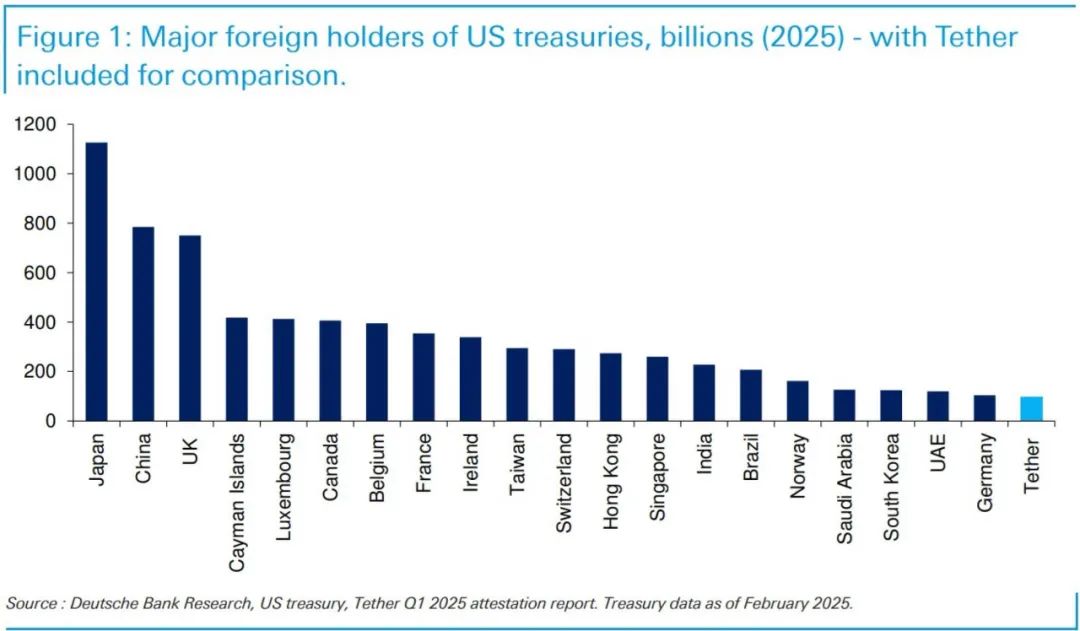 在这一战略图景中,全球最大的稳定币 USDT 发行商 Tether 的角色日益突出。数据显示, Tether 持有的美国国债规模已可与德国等主要工业国等量齐观。 这使得 Tether 不仅是加密市场的重要基础设施,也成为美国国债不可忽视的持有者。