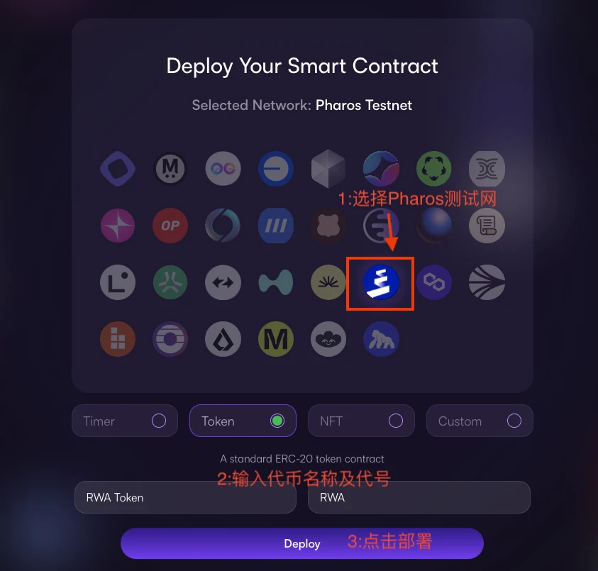 但除了以上官方列举的交互任务外,用户还可以自行在 Pharos 测试网上部署合约,丰富交互数据。点击进入 contracts ,如下图,选择 Pharos 测试网部署合约,用户可在测试网上部署简单计时器合约,也可发行 ERC-20 代币或者 NFT。以部署代币合约为例,只需输入代币全名及代号即可完成部署。