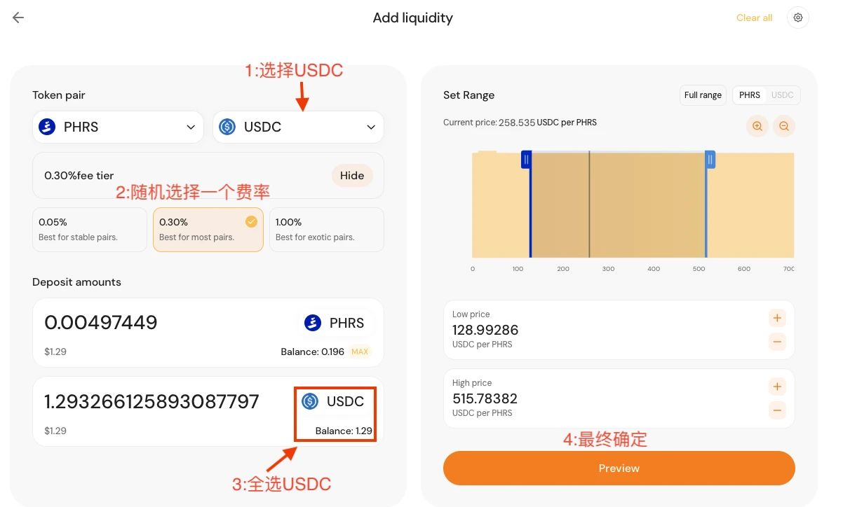 然后选择刚刚兑换过的 USDC,再随机选择一个费率,将此前兑换的 USDC 全部投入 LP 中,系统会自动匹配所需要的 PHRS 测试代币。最后点击点击授权,再确定添加流动性即可。