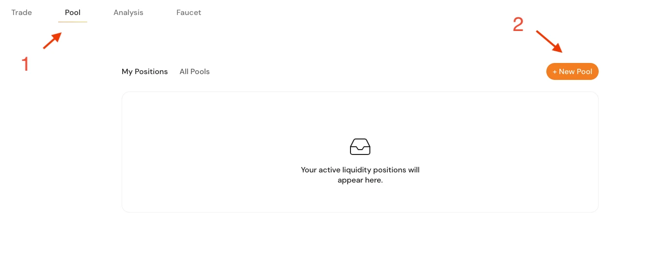 第二个链上任务为添加流动性。兑换成功后,直接点击左上角的“Pool”,然后点击“+New Pool”创建新的 LP。如下图。