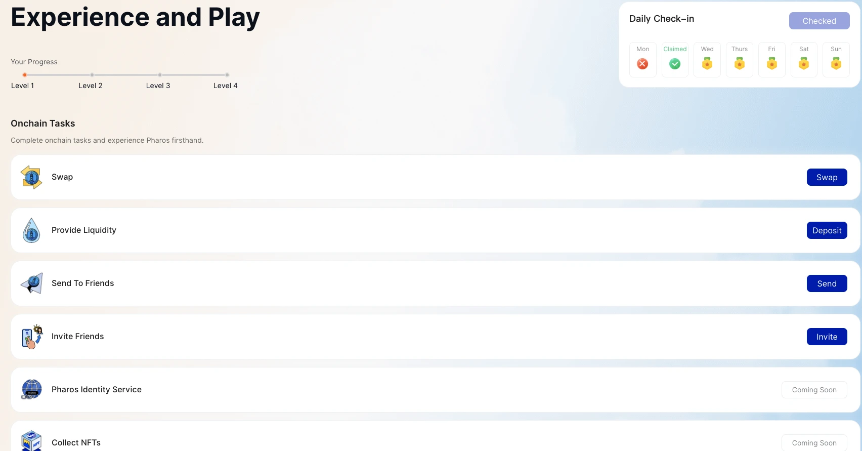 待测试币到账后,点击官网上方“Experience”跳转测试网任务界面,目前测试网任务可分为每日签到、链上任务和社交任务。如下图,先点击右上角进行签到,签到不可补签,因此记得每日按时定好闹钟。