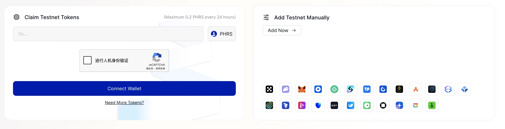 如上图左边所示,完成人机验证后即可领取 0.2 PHRS 测试币,用户可每 24 小时重复领取一次。若是想一次性领取更多测试币,也可登录 ZAN 的水龙头领取网址免费获得 0.2 PHRS 测试币(ZAN 为蚂蚁金服集团旗下 Web3 技术公司)。