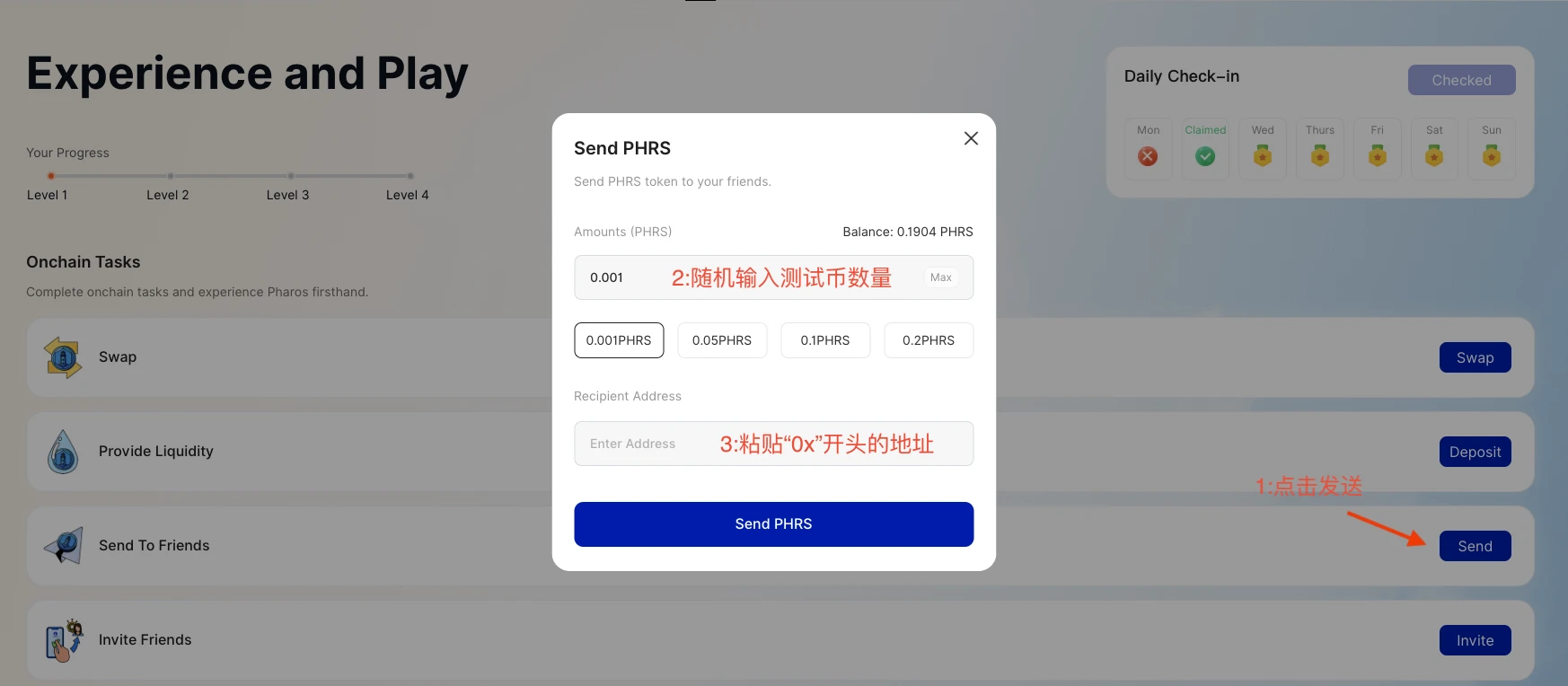 第三个链上任务是向其他 EVM 地址发送代币,回到 Pharos 测试网官网 页面,点击“Send”再输入想要发生的测试代币和接收地址即可。Pharos 完全兼容 EVM,因此用户可直接粘贴自己其他”0x“开头的地址。