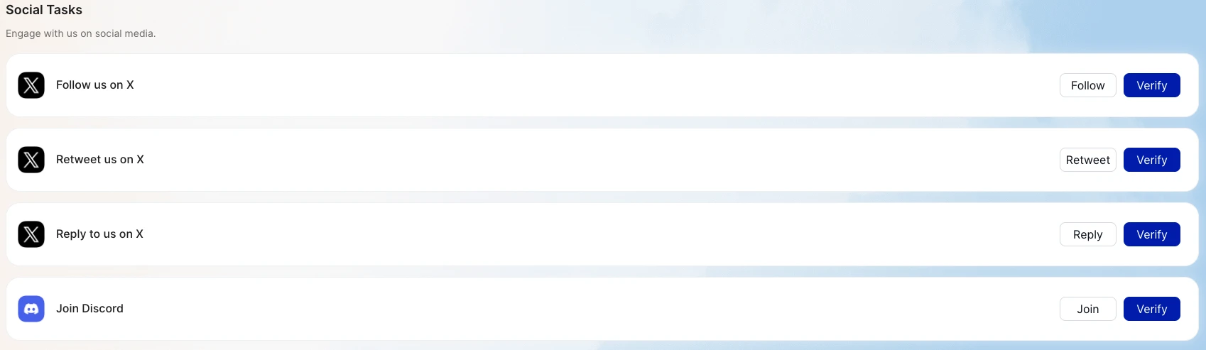 除了链上任务外,用户还可通过完成社交任务提升等级。如下图,只需要关注 Pharos 官方 X 账户、转发及评论特定推特和加入 Discord 社区即可,均为一次性任务。